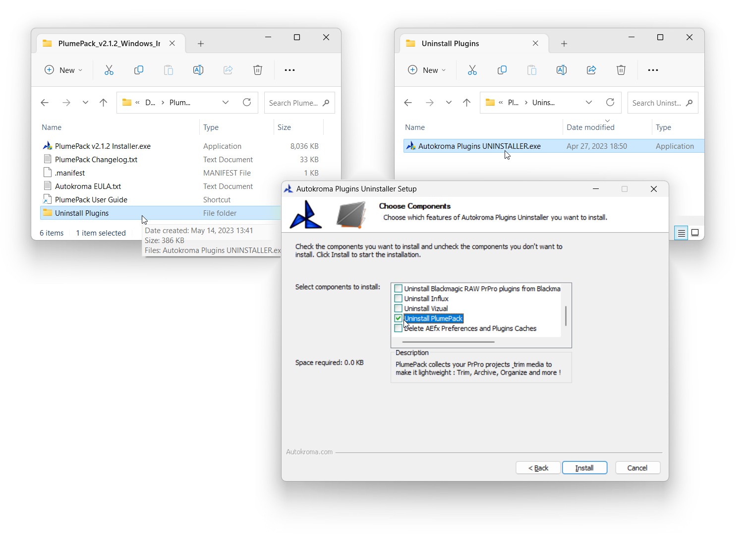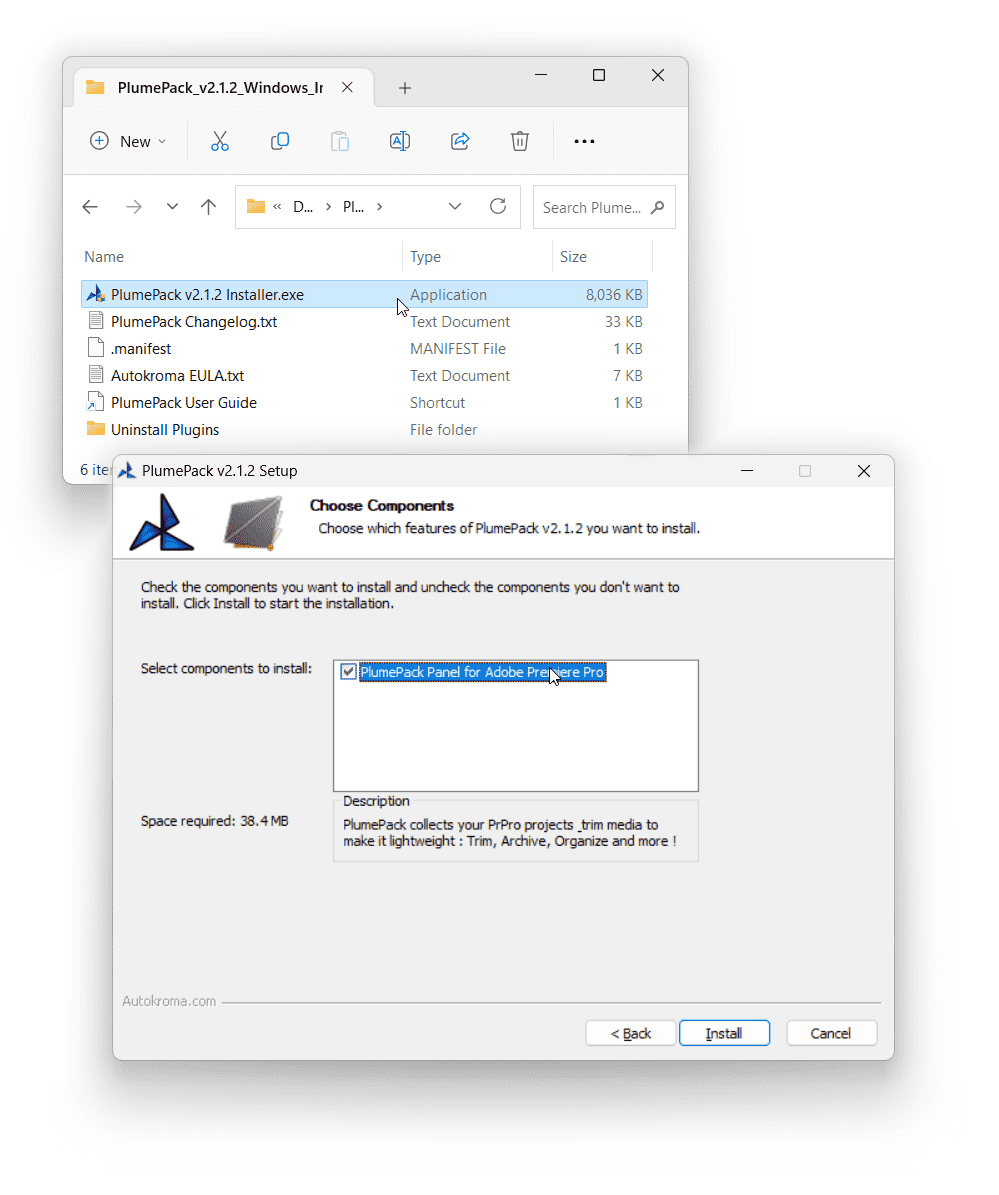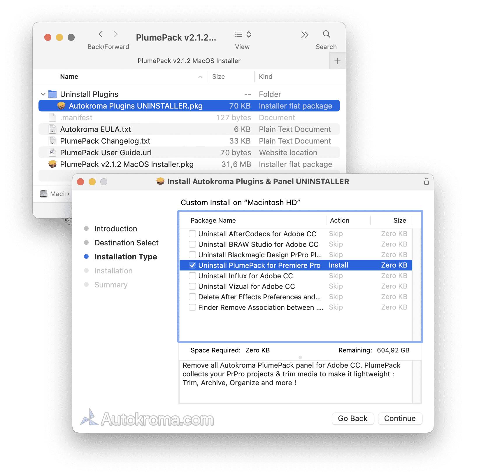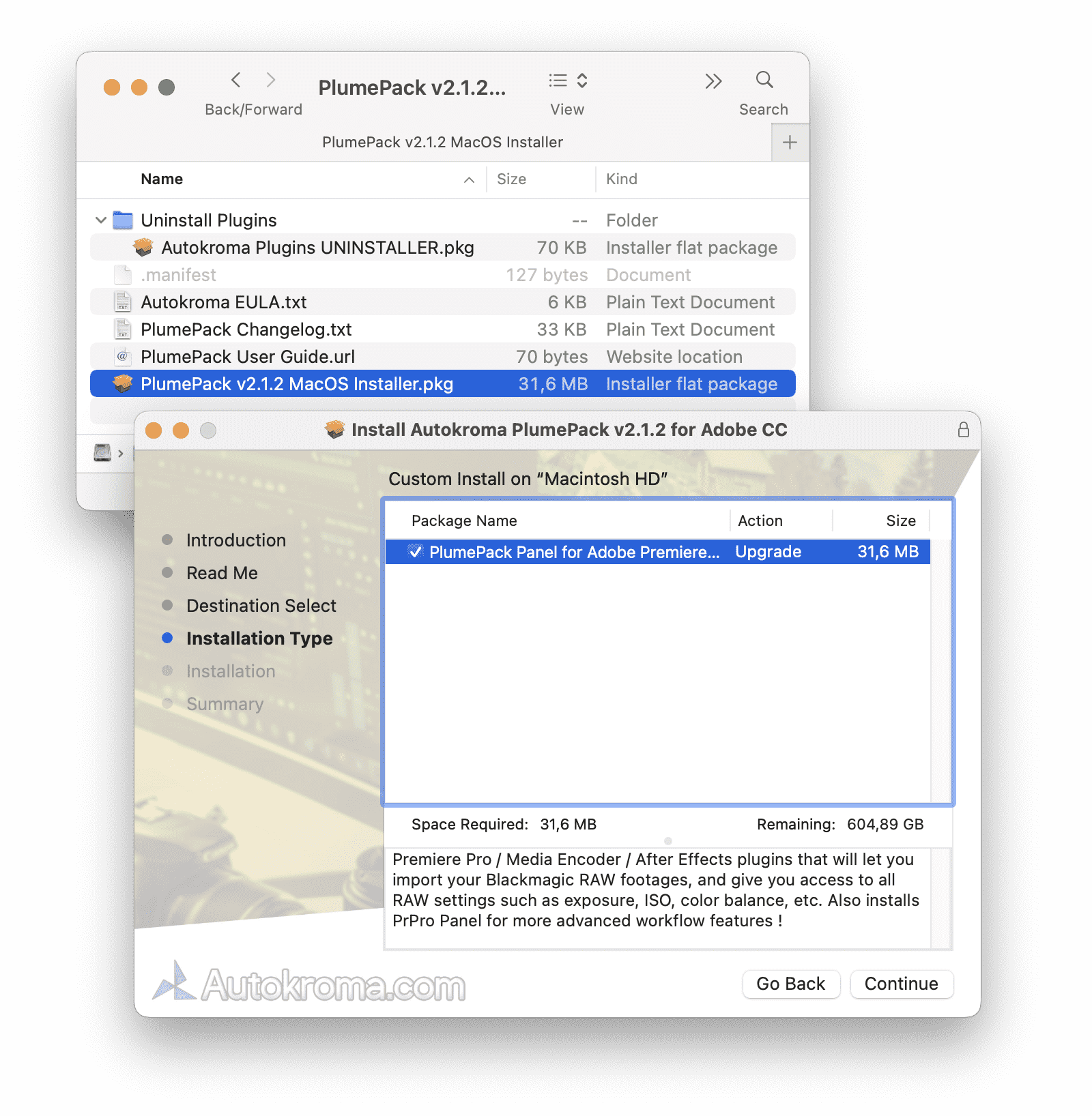 - macOS: PlumePack Installer is now packaged as a .DMG file with a nice interface, simply double click on the download .DMG file and run the .pkg installer that shows up in the mounted DMG. The installer also creates an Autokroma folder inside /Applications/ with a PlumePack Uninstaller and a link to PlumePack Settings and License popup so you can more easily access them like any other macOS Application